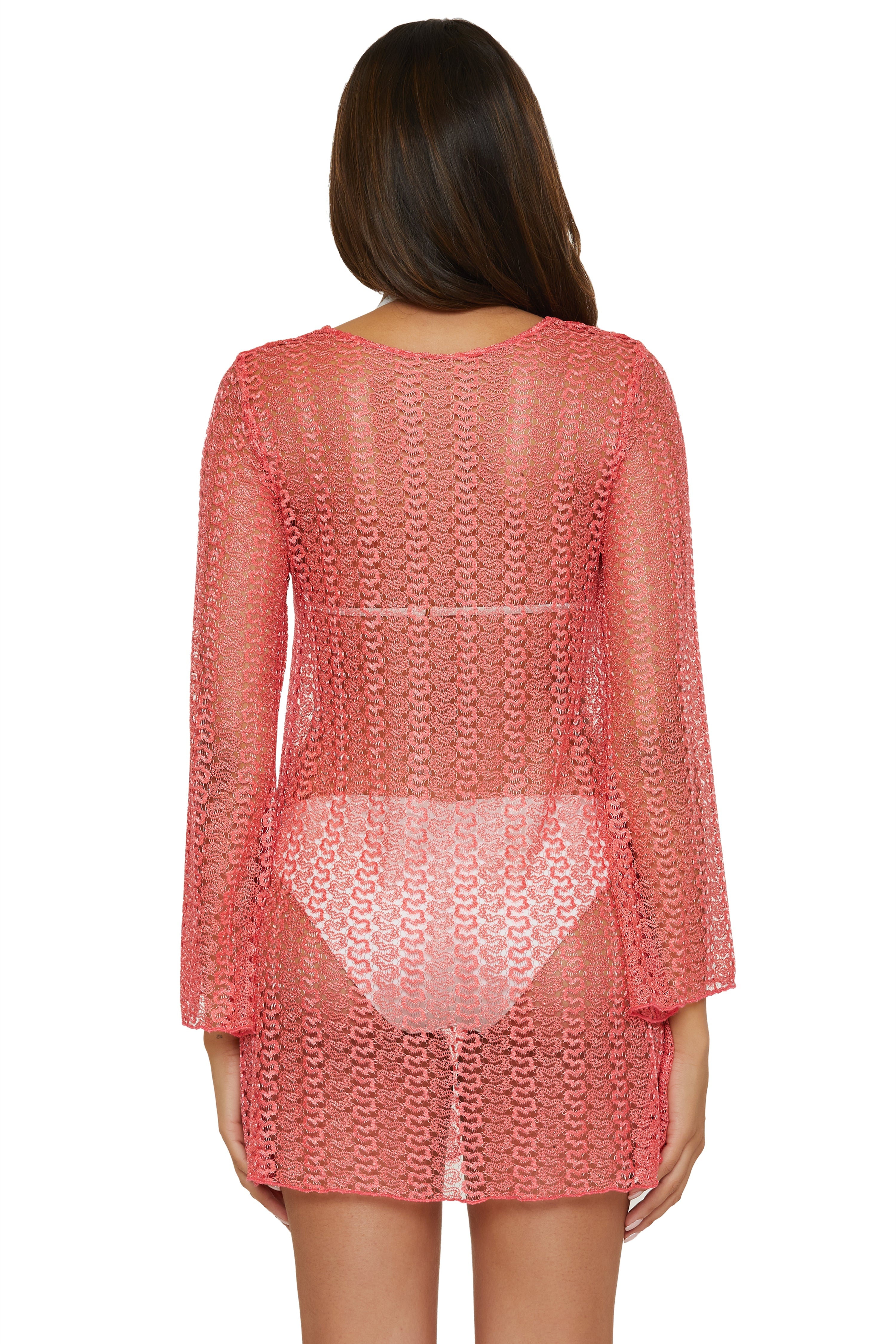 -Pull over lace crochet tunic -Gold metal square ring at center tab -Plunge neckline w/ keyhole -Long bell sleeves | Side slits -Gold metallic yarn accent | 95% Nylon 5% Metallic -34" from high point shoulder