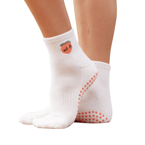 The 'Peachy' grip socks are a vibrant and playful addition to your Lagree, Pilates, Yoga, or Barre gear. These socks bring a burst of energy and style to your workout routine. They provide not only a fun aesthetic but also the essential grip and comfort needed for your fitness activities.