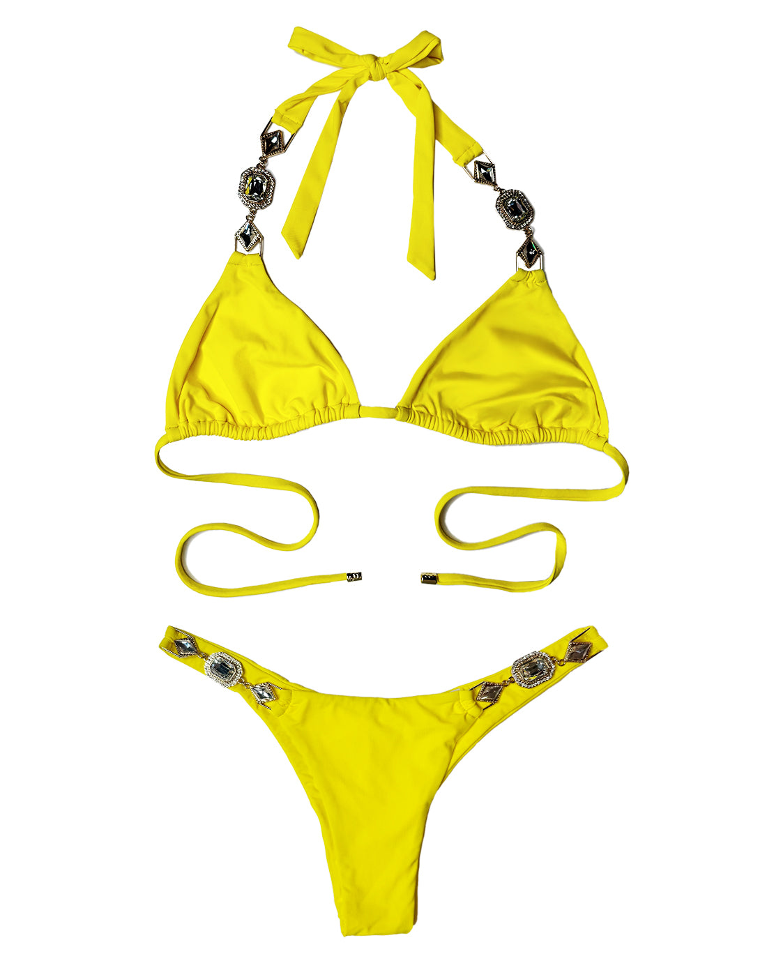 The Raja Tango Bikini Bottom is designed to blend bold style with a flattering fit. In a radiant sunshine yellow, this tango-style bikini bottom features stunning crystal-embellished hardware at the hips, adding a luxe touch to your beach or poolside look. Offering moderate back coverage with a curve-enhancing scrunch detail, the Raja Tango Bottom is perfect for showing off your shape while keeping it chic. Pair it effortlessly with the matching Raja Triangle Top for a head-turning ensemble that’s made for tropical getaways and sun-drenched adventures.