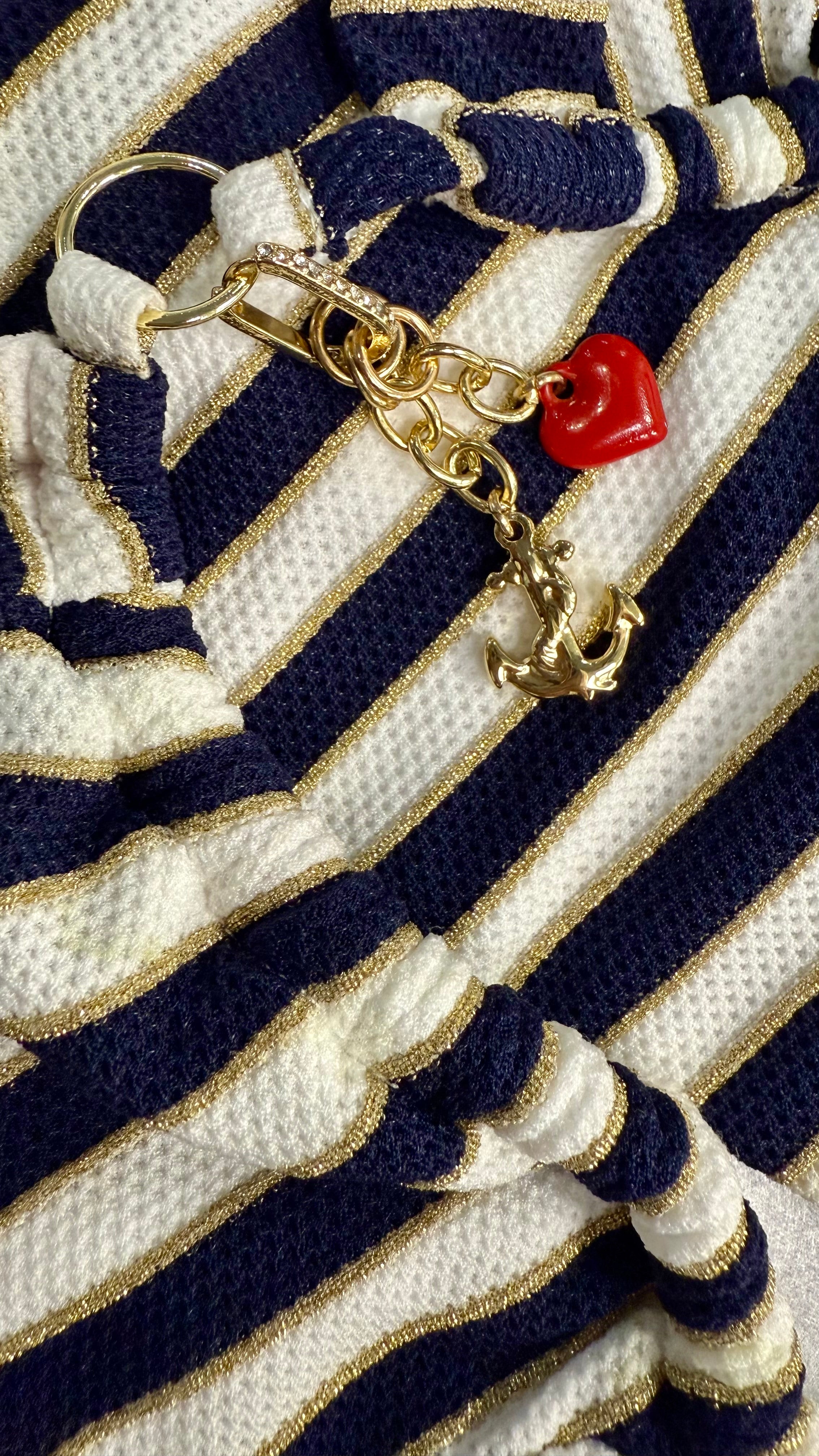 Add a touch of seaside elegance to your swimwear with our Nautical Anchor Bikini Charm. This gold-toned charm features a delicately sculpted anchor that dangles playfully from the bikini top, capturing the spirit of sun-soaked adventures and salty air. A nod to classic maritime style, it’s the perfect finishing detail for your beachside look—equal parts chic and charming.