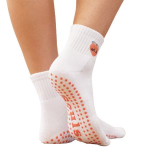 The 'Peachy' grip socks are a vibrant and playful addition to your Lagree, Pilates, Yoga, or Barre gear. These socks bring a burst of energy and style to your workout routine. They provide not only a fun aesthetic but also the essential grip and comfort needed for your fitness activities.
